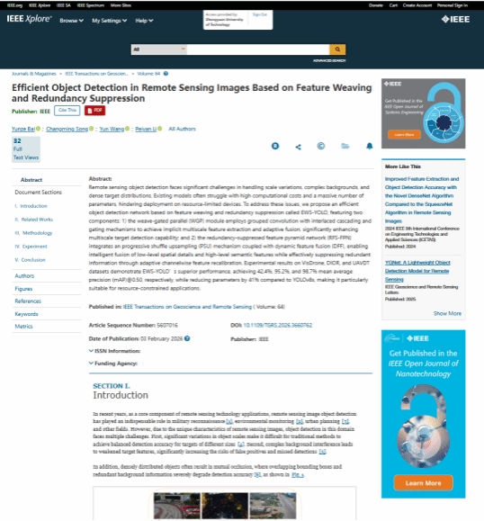 近日,我院宋长明教授团队在地球科学和遥感图像处理领域的顶级期刊《IEEE Transactions on Geoscience and Remote Sensing》(中国科学院一区top,影响因子8.6)上发表题为“Efficient Object Detection in Remote Sensing Images Based on Feature Weaving and Redundancy Suppression”的研究成果(论文doi:10.1109/TGRS.2026.3660762)。该论文以中原工学院为第一署名单位,论文通讯作者为研究生指导教师宋长明教授,2023级研究生白云泽为第一作者。